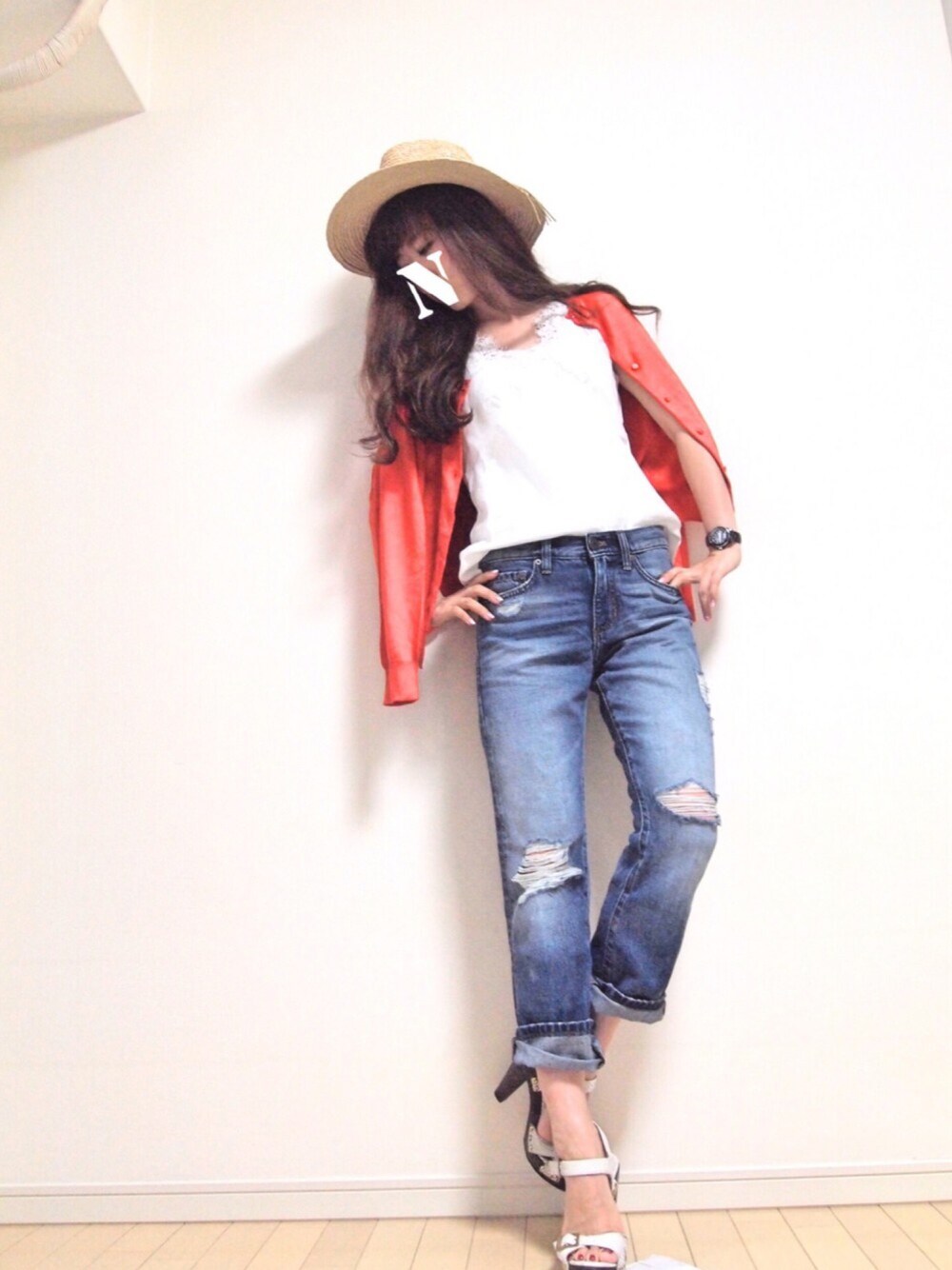 インスタ更新中💕▷▷natsu_mmer🎀🦄💕 カジュアルでシンプルなコーディネートに赤のカーディガンで差し色を❤️❤️ 夏でも冷房寒いとこ多いのでカーディガンマスト!😉⭐️👍✨ 生地がさらっとしてて着やすいのでヘビロテ中😍イロチで黒もゲットしたよ😉✨✨ ハットでカジュアルさアップできたかな😁🌟🌟 なんか色合いがルフィみたいになったwww