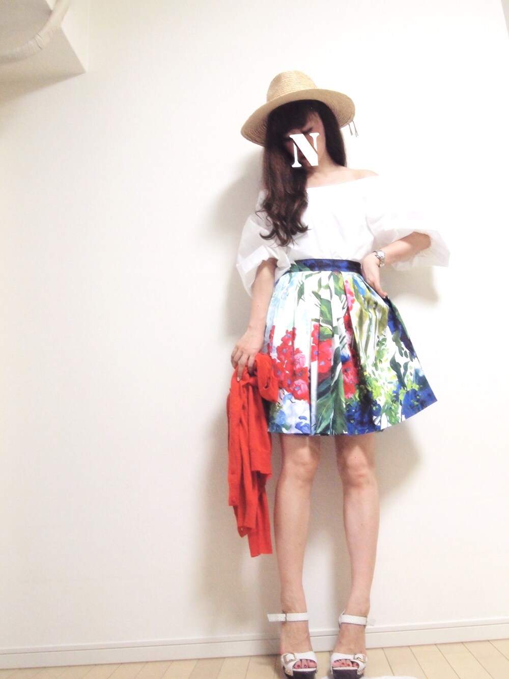 インスタ更新中💕▷▷natsu_mmer🎀🦄💕 大好きなブルーガールのスカートに大好きなアクアガールのオフショルでご機嫌😊🎀🌷💓✨ 赤のカーディガンとスカートの赤あわせたよ💕 またまたハットでちょこっとだけカジュアルダウン🎀 ジミーチュウの白サンダルヘビロテすぎ…😉😉🦄🌟🌟