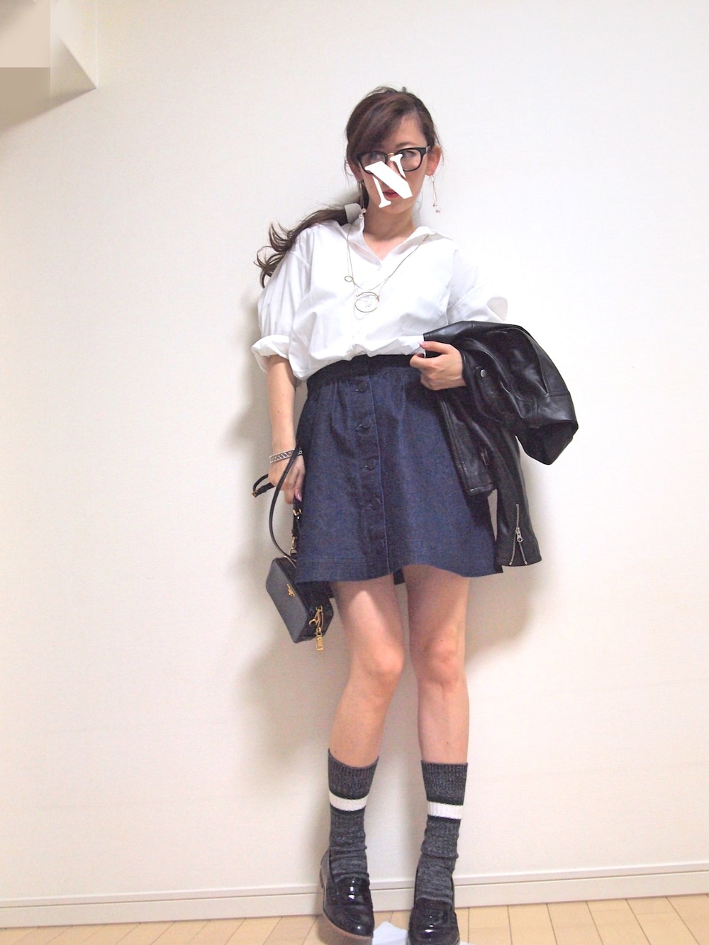 インスタ更新中💕natsu_mmer🎀🦄💕 カジュアルでシンプルといったらシャツ×デニム💓💓 をミニスカートでかわいくしよーとしたら女子高生みたいになった…😱😱 ライダース着たら大人に戻ります😂😂 アクセしっかりめ😍😍