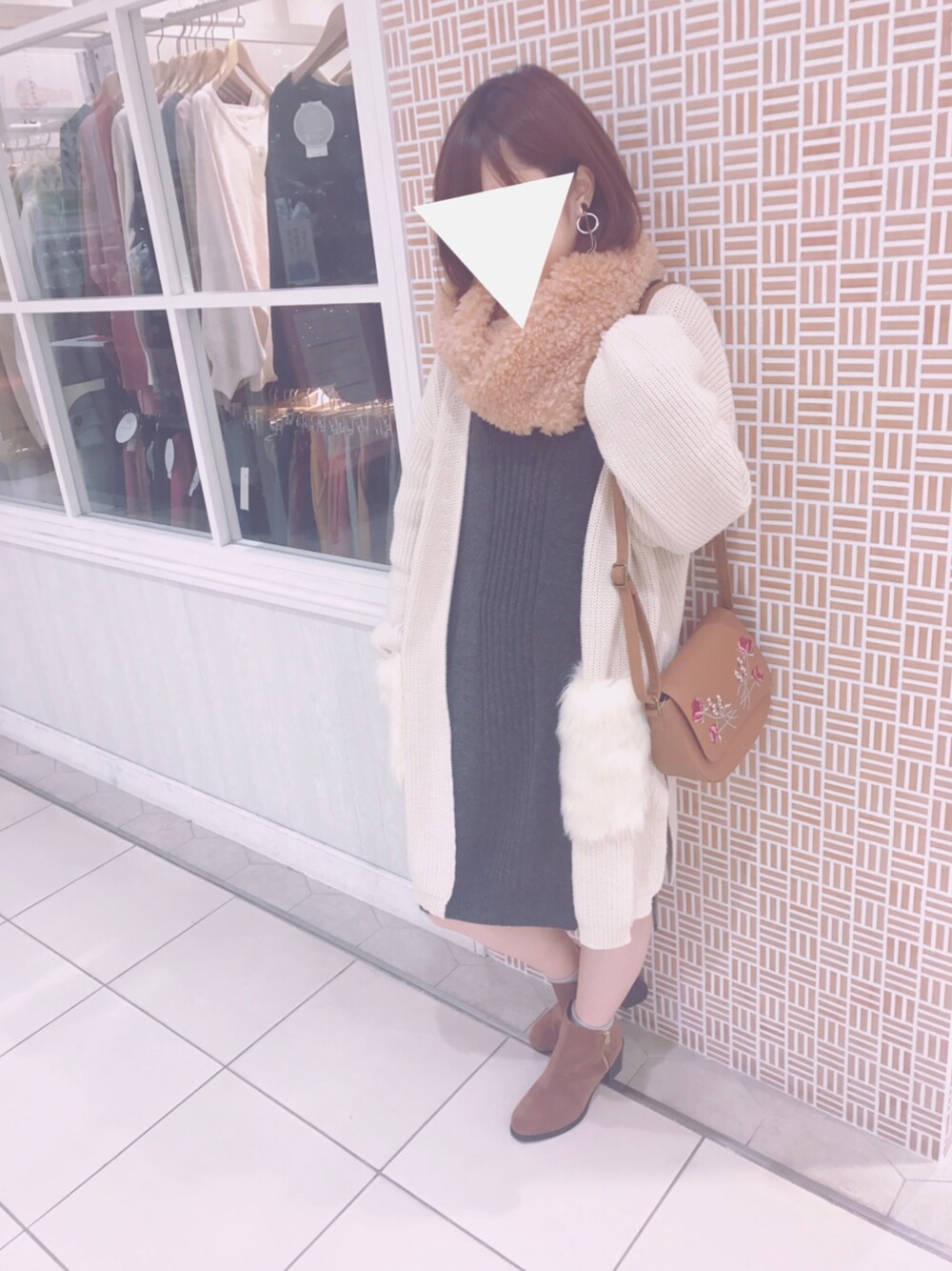 ふわふわもこもこで カジュアルだけど女性らしい 大人デートコーデです💓 ワンピースのリブ柄と カーディガンで作ったIラインで スタイルアップ🌷 そして首回りのプードルファーの スヌードで小顔効果🐶💓💫