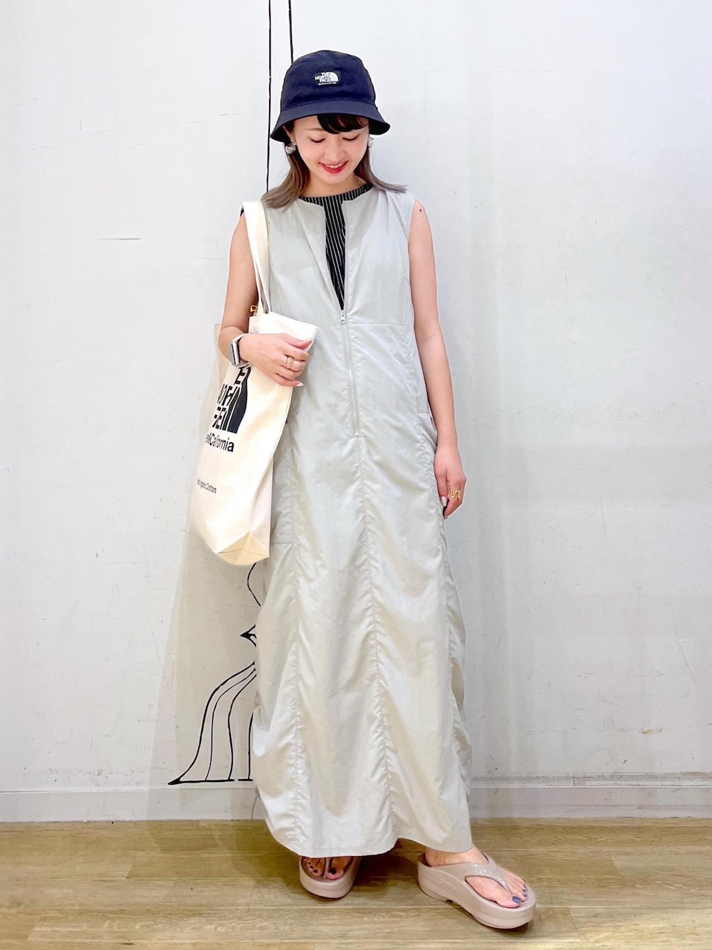 夏のお出かけにおすすめな涼しいワンピースコーデです◡̈ 帽子、ワンピース、サンダルと水に強いアイテムなので海やプールにも◎