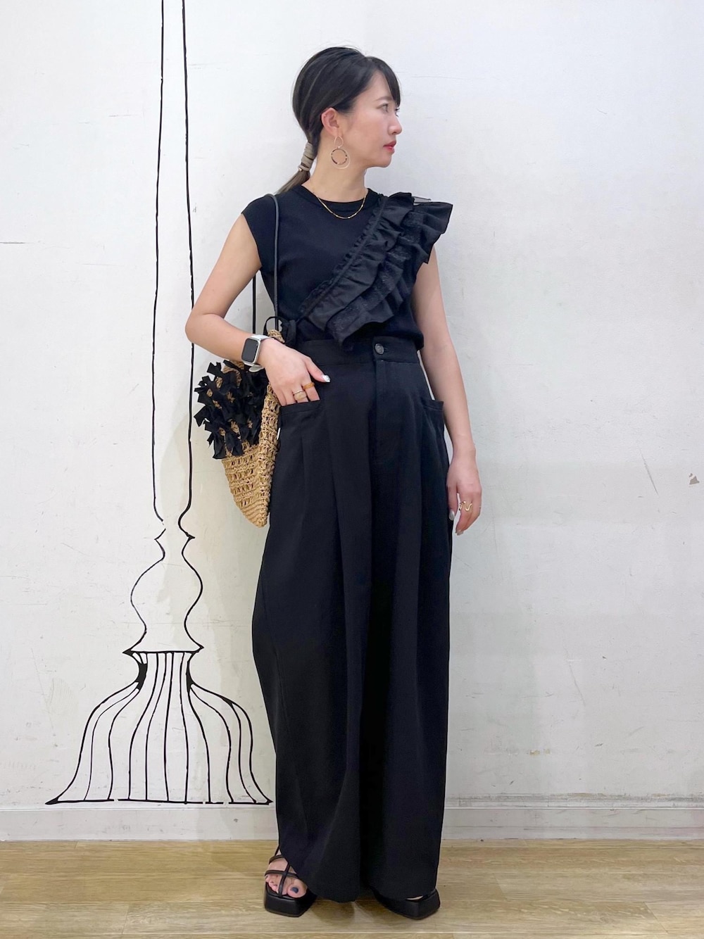 重たく見えがちなオールブラックも、細ストラップやゼロスリーブなど肌の見える面積を増やすことでかっこよくまとめられます◡̈!ハイウエストパンツで目線を高く、細見え効果も◎