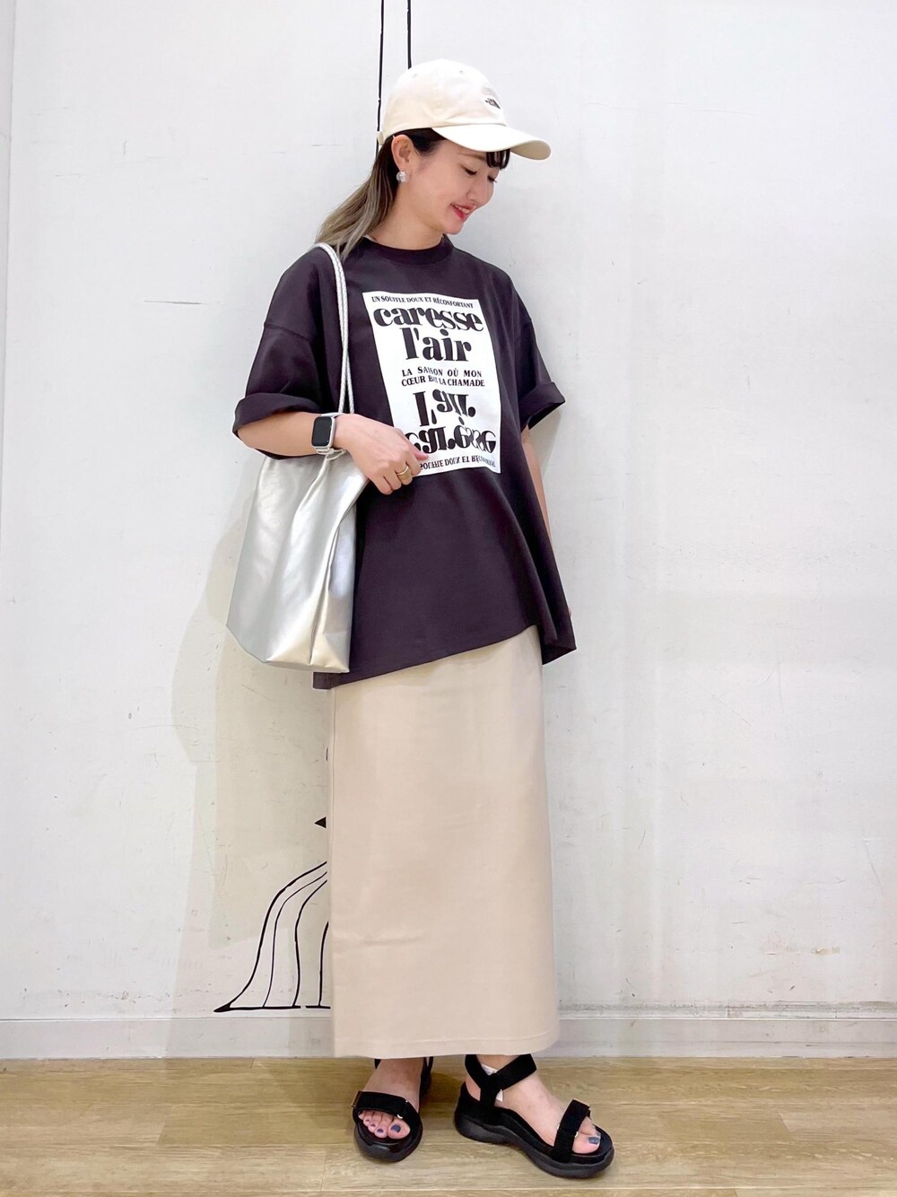 汗ジミ防止機能の付いたオーバーサイズTで涼しく、タイトスカートもチャレンジしやすいインしないスタイリングです◎