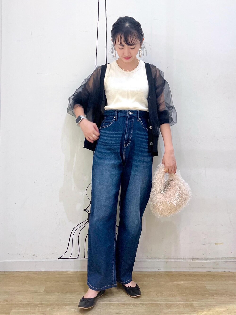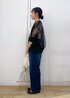 長袖でも透け感のあるカーディガンやフリンジ素材のバッグで秋を先取りしたコーディネートです◎