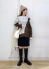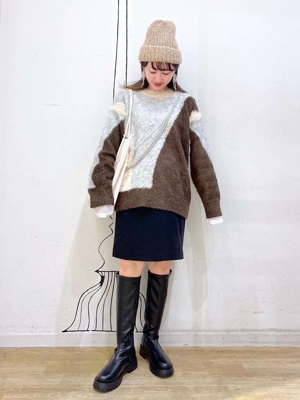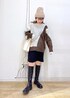 足を出すのが苦手な方におすすめなミニスカートコーデ◎ 足元をロングブーツにすることで露出する面積を抑えられるのでチャレンジしやすくなります◡̈! オーバーサイズのニットで華奢みえも◎ ※インナー、アクセサリーは私物です