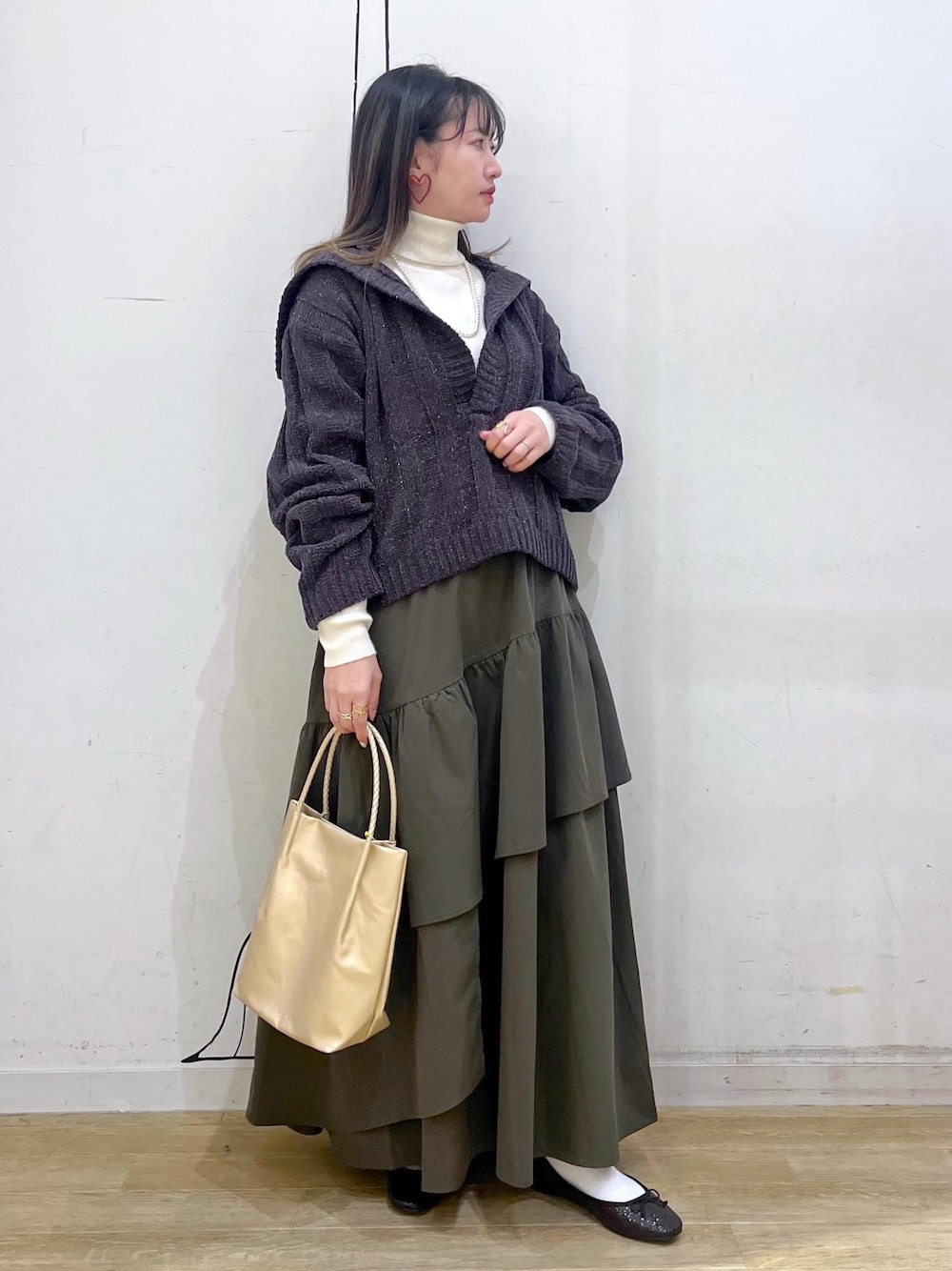 ラメ糸が混ざったアンジェリーナニットをメインにしたフェミニンコーデです◎ 足元をスニーカーに変えて、キャップを被ると一気にカジュアルコーデにも着回せます◡̈