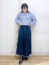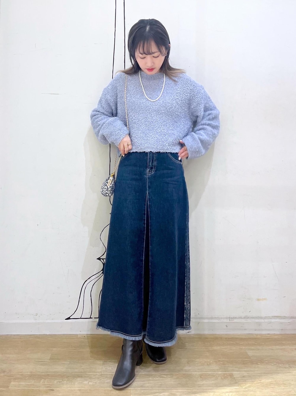 スパンコールがキラキラ可愛いニットをデニムスカートでカジュアルに◎ ブルーを選んで明るいワントーンコーデにしてみました◡̈