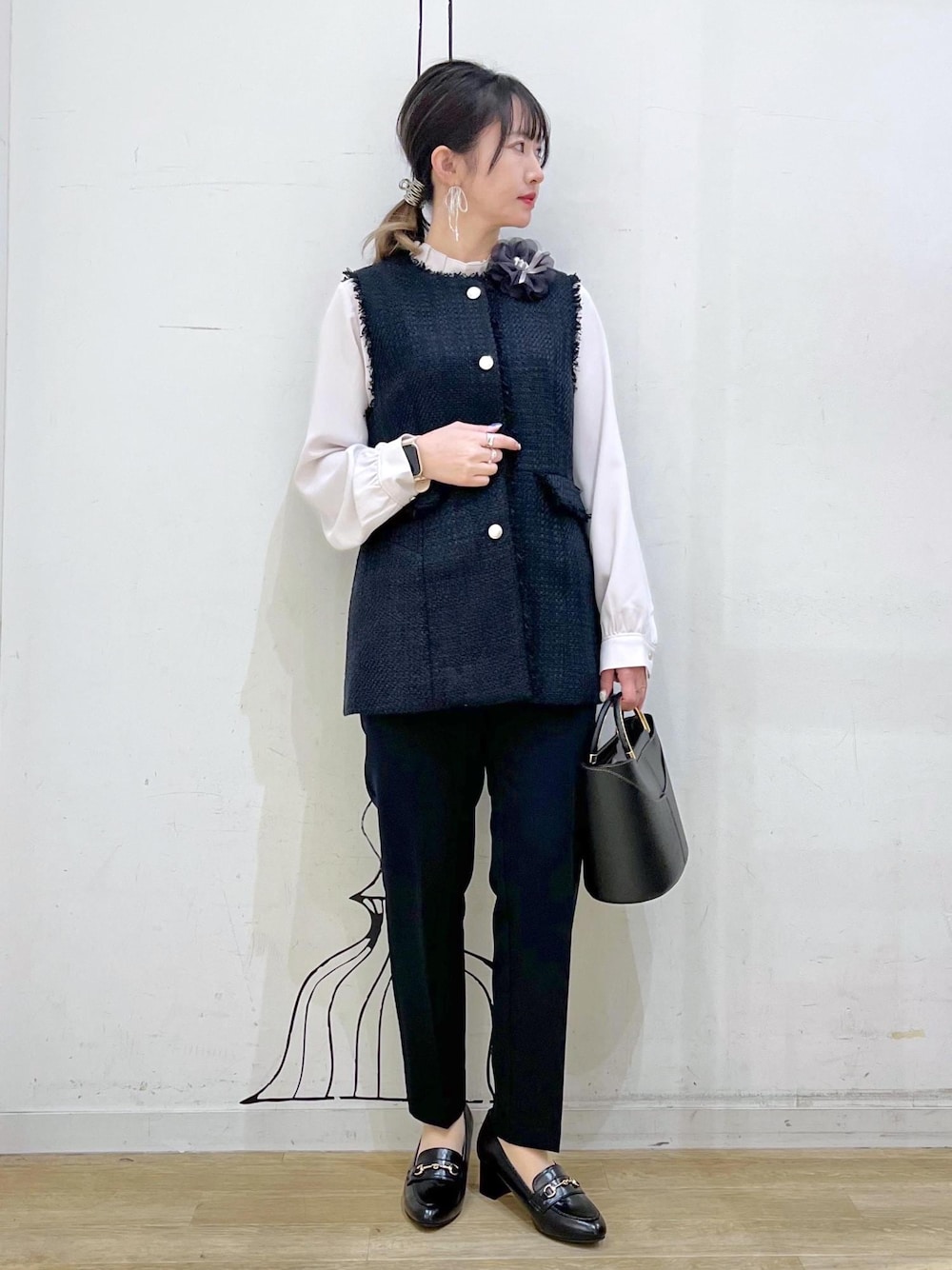 ツイード素材のジレで体型カバーも叶えるトレンドのセレモニースタイルです◡̈ くすみピンクのブラウスにすることで華やかさも◎