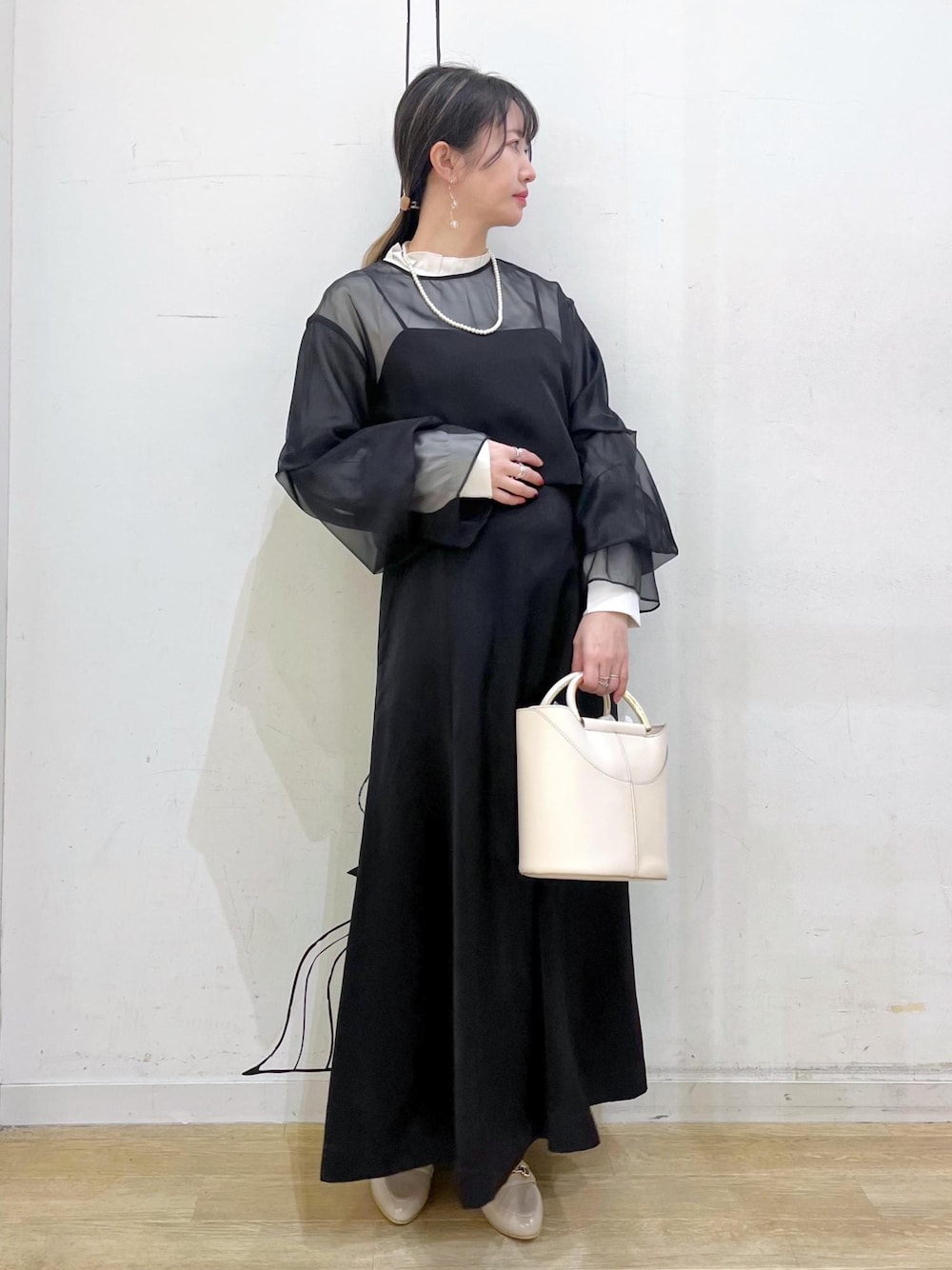 セットアップのキャミワンピのインナーにキレイめブラウスを着用して肌の出る面積を抑え、 セレモニーでも使えるスカートスタイルにしてみました◡̈ トップスとワンピースを別々でも着回せるので幅広いコーディネートに使っていただけます◎