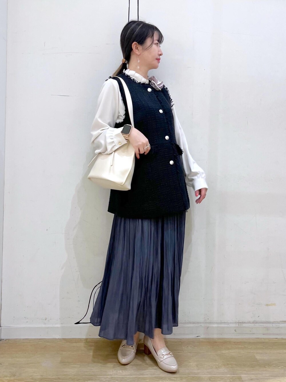 スカート派におすすめのセレモニーコーデです。 トレンドのジレを加えることで腰周りの体型カバーにも◎