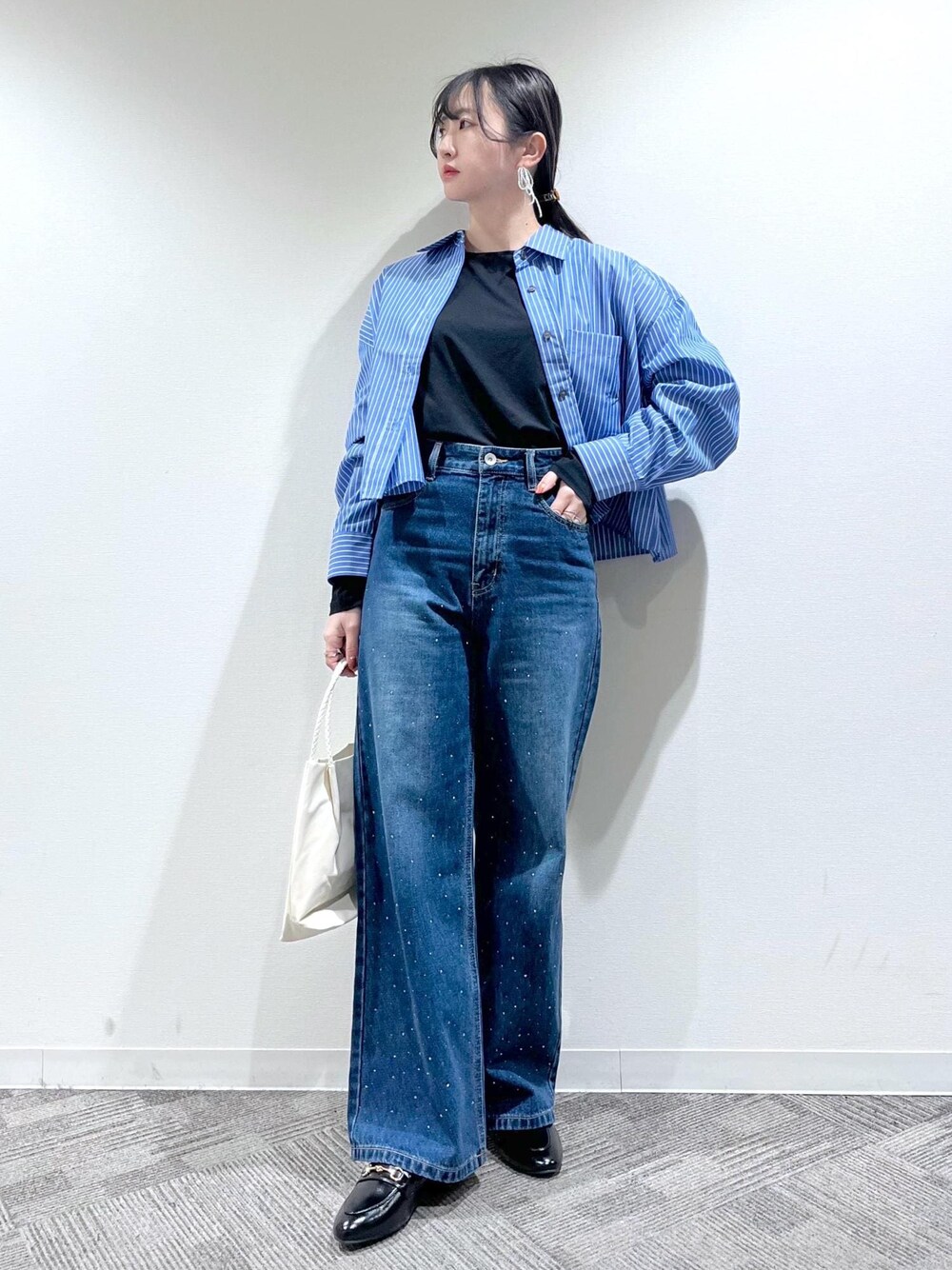 キラキラが可愛いビジューデニムをメインに、 ワントーンでコーディネートしました◎