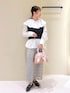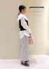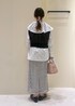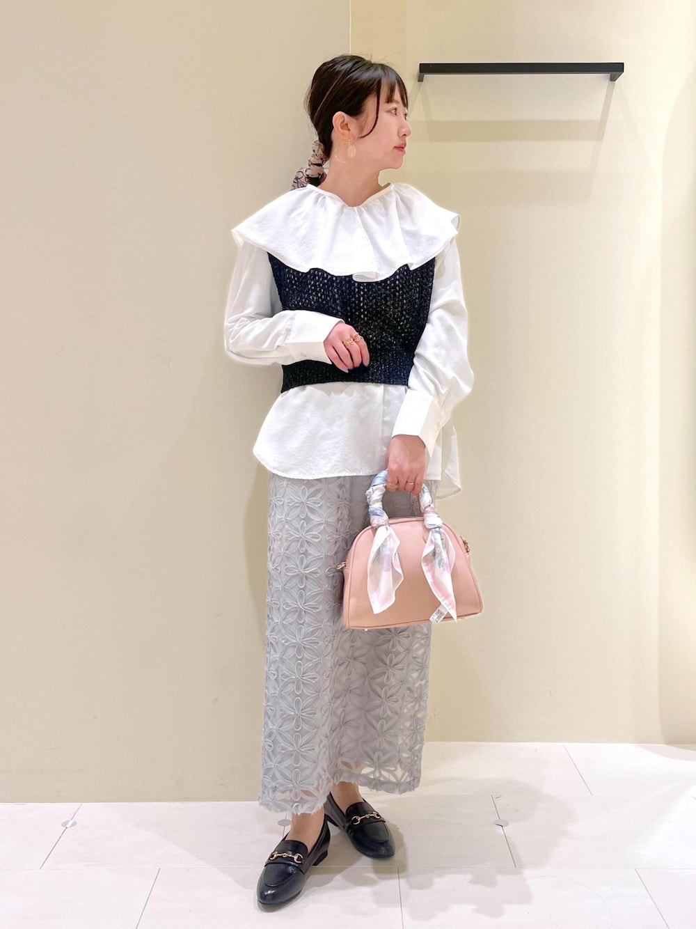 モノトーンで揃えたコーディネートにカバンのピンクで春らしさを足した組み合わせです◡̈ デザイン性のあるブラウスで目線が上がり、スタイルアップ効果も◎