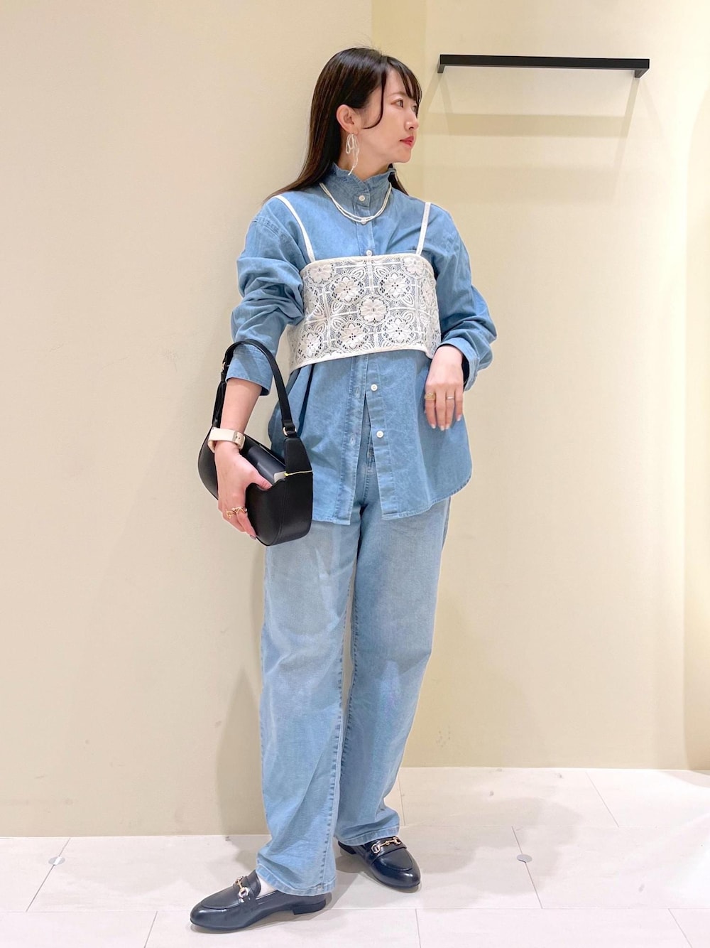 色味を合わせたデニムアイテムでセットアップ風コーデ◎ フリルカラーに合わせてビスチェを加えてフェミニンさもプラスしました◡̈