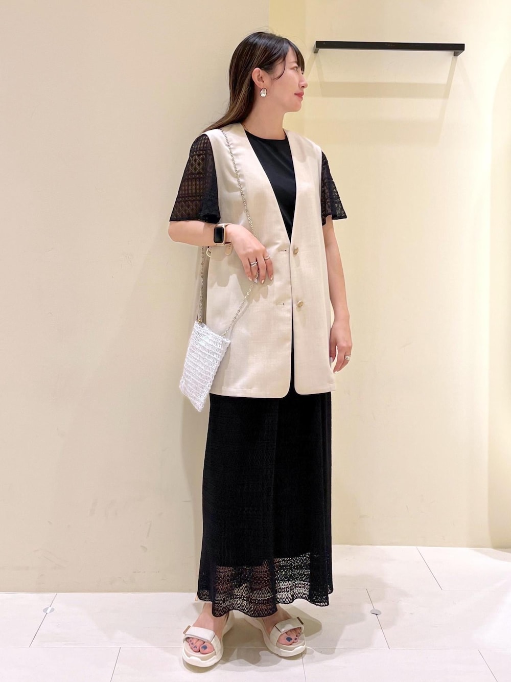 レース切り替えのトップスとレーススカートをワントーンでリンクし、 ジレでアクセントを加えたコーディネート◎ インスタイルもジレを羽織ると体型カバーが叶います◡̈