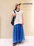 ブルーのスカートを主役にお出かけにもおすすめなカジュアルコーデ。 スニーカーサンダルで沢山歩く日にもおすすめの着回しです◡̈