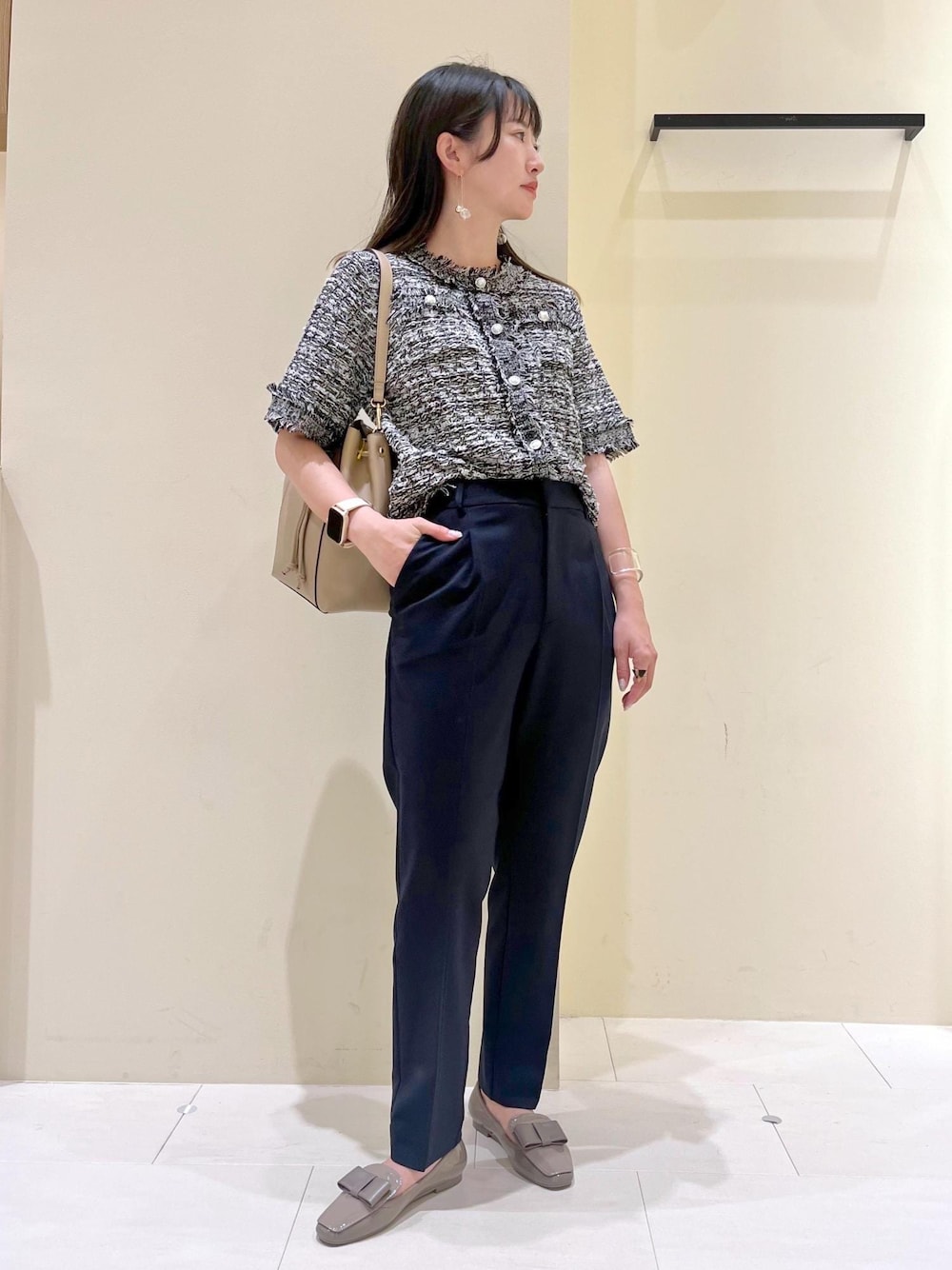 夏でも涼しく着られるツイードカーディガンを使ったお仕事コーデ。 晴雨兼用のローファーで梅雨時期も快適に◎