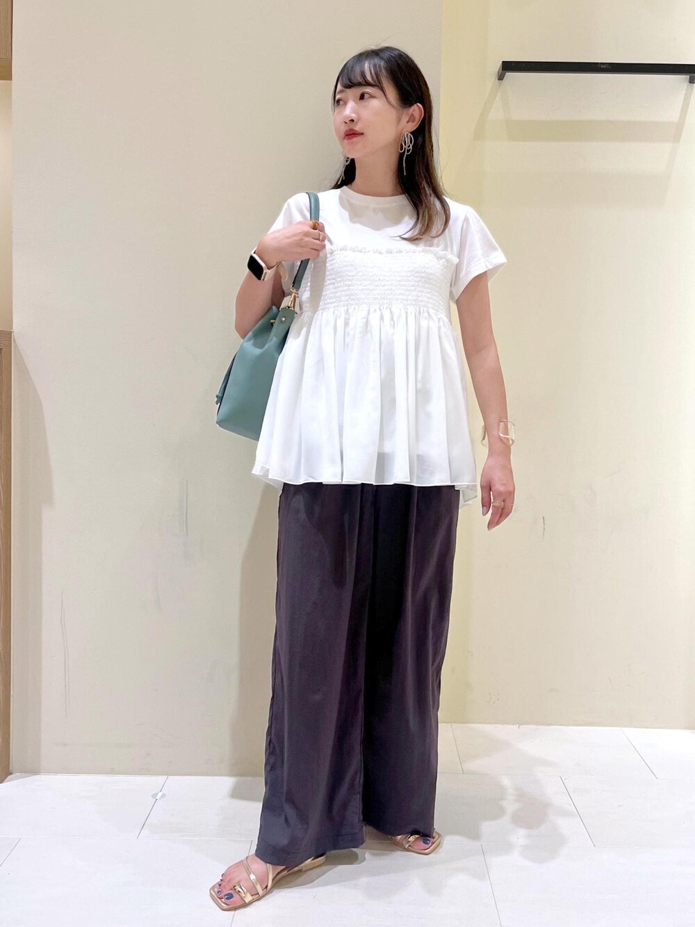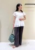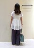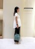 1枚でレイヤード風に着こなせるトップスを使ったコーディネート。 モノトーンでまとめてシンプルにしつつ、ブルーグリーンのバッグを差し色にしました◎