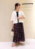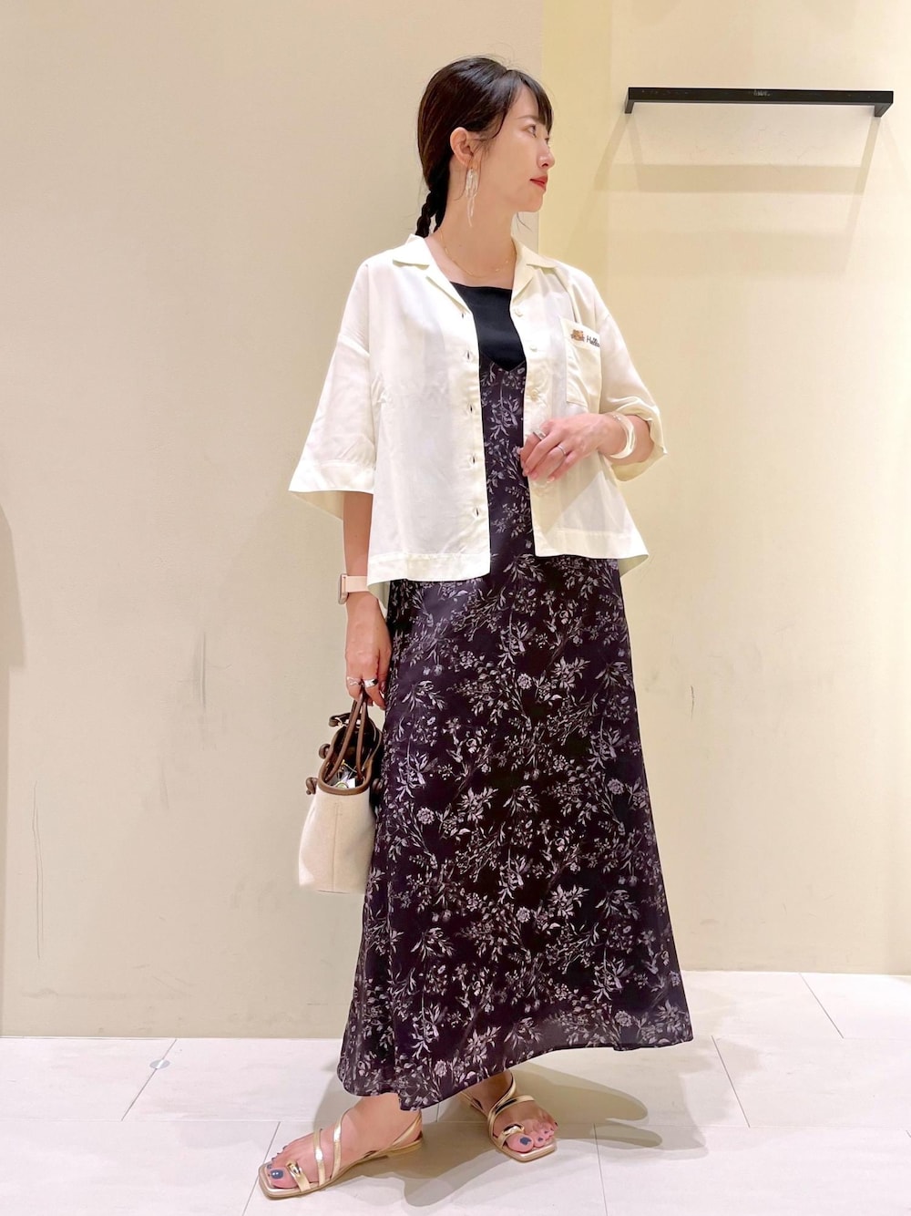 ハローキティコラボの開襟シャツ×花柄ワンピースでリゾートコーデ◎ 可愛らしくなりがちなアイテムもモノトーンでまとめる事で大人カジュアルに◡̈