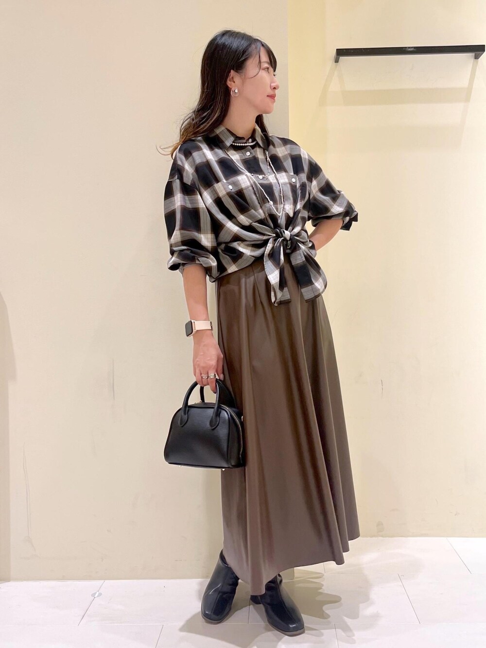 カジュアルなオーバーサイズのチェックシャツをきれいめに着回したコーディネート。 ウエストマークすることで骨格ウェーブさんもメリハリのある着こなしに◎ ※アクセサリーは私物です