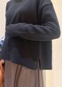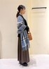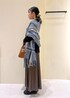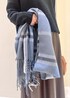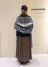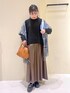 毎年人気のパチパチしないニットシリーズを使ったコーディネート◎ ブラウン、ブラックのワントーンコーデにブルー系のストールを差し色に入れました◡̈