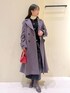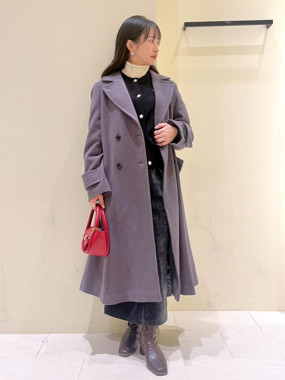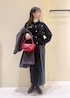 モノトーンでまとめたコーディネートに 赤のバッグをさし色にしてホリデーシーズンにぴったりな着こなしに◎