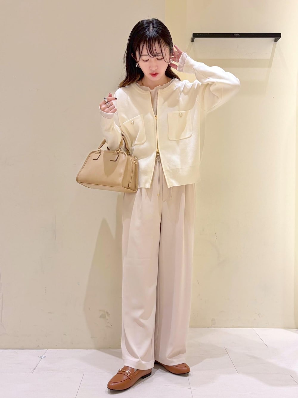 春らしく淡色のワントーンコーデ◎ 小物をキャメルカラーで統一して明るい印象に◡̈