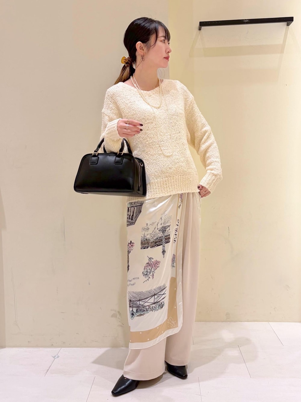 淡色でまとめたコーディネートに黒の小物でアクセントを。 同系色のスカーフなら腰巻きアレンジもチャレンジしやすいです◡̈! ※アクセサリーは私物です