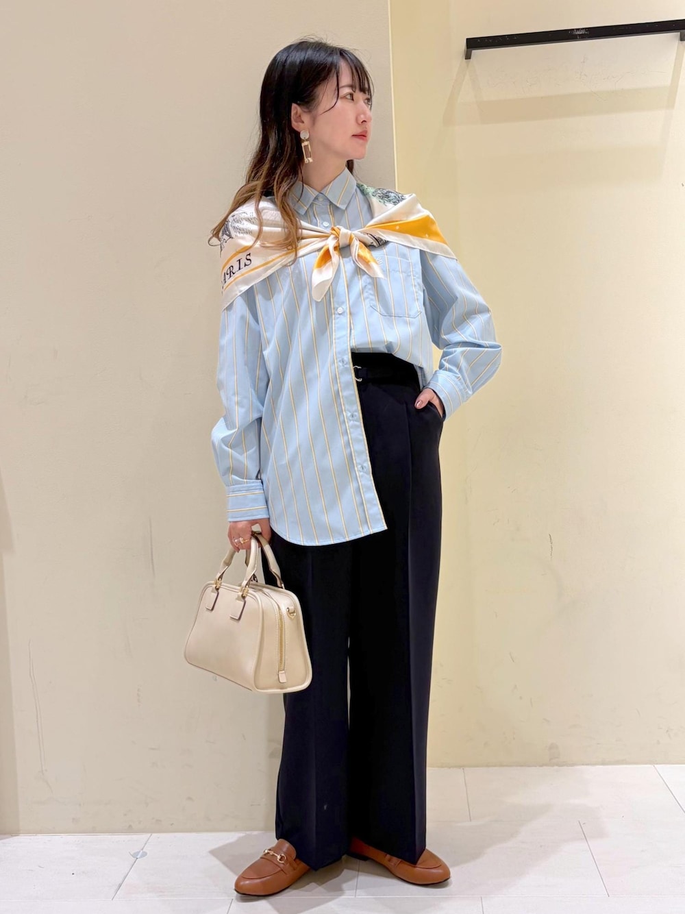 シャツ×ワイドパンツのシンプルコーデにスカーフをアクセント日加えた春コーデ◡̈