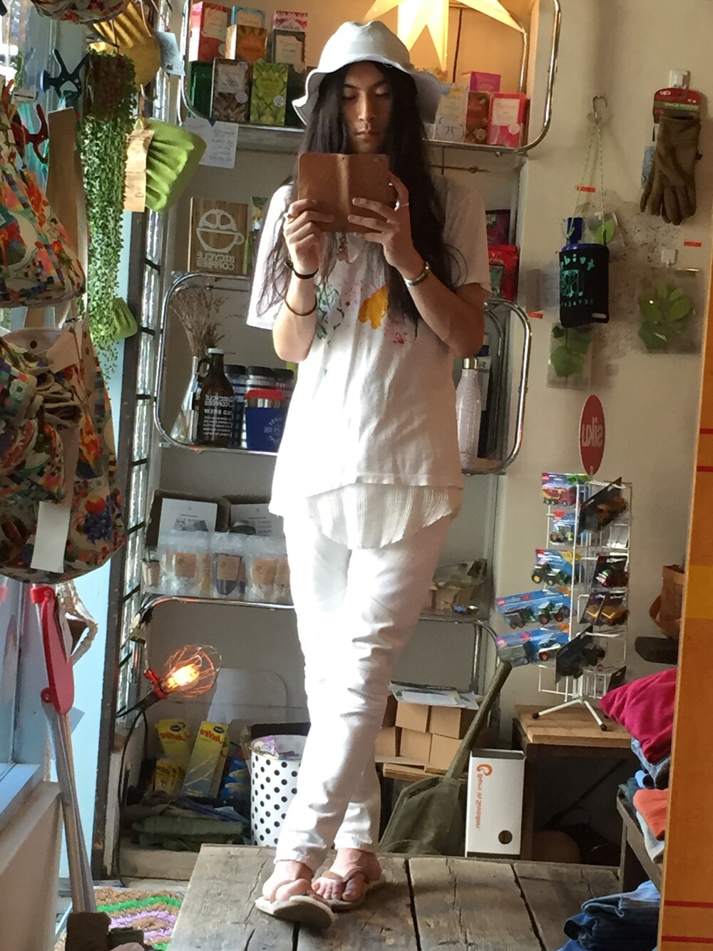 オールホワイト。アトラクとマンのデニムパンツとハット。