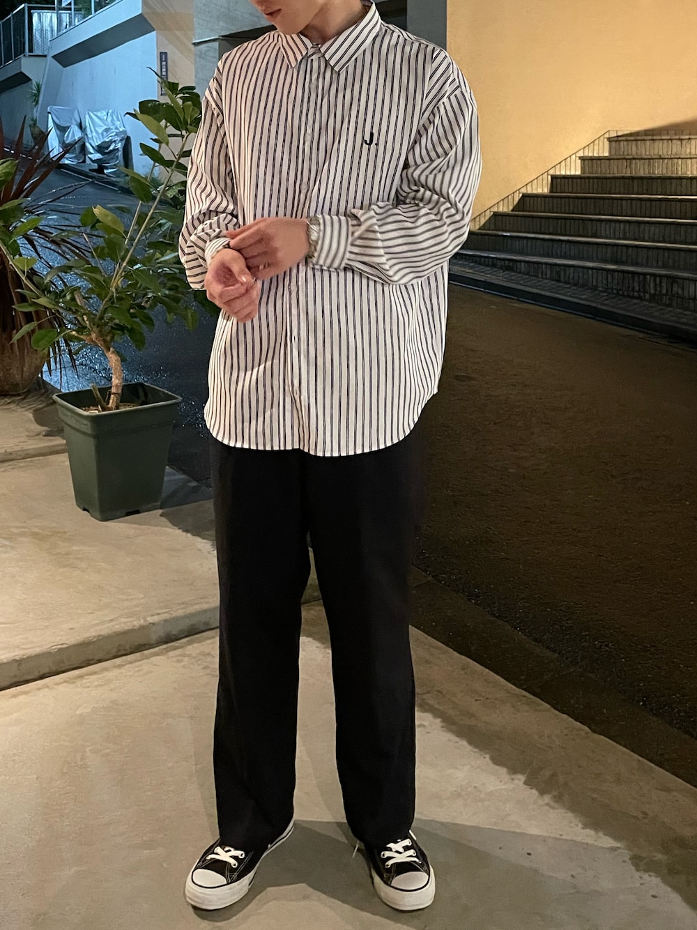 tinaのストライプシャツ レディースブランドですが、ユニセックスであるため、メンズにもおすすめの商品 shirt/TINA:JOJUN pants/vintage shoes/converse Instagramアカウント【@99.9_29】