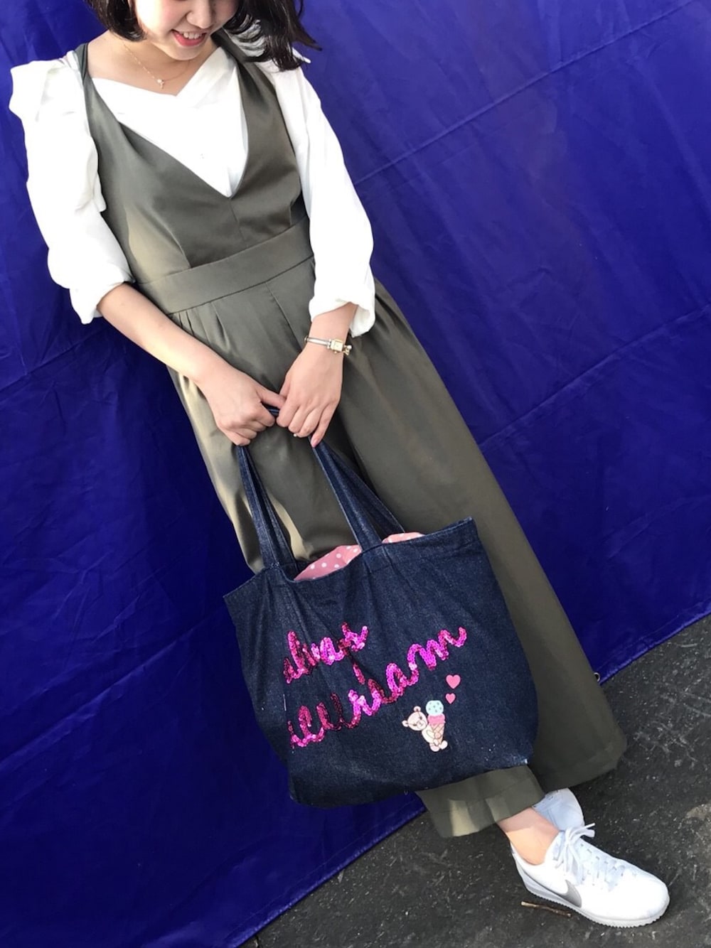 荷物がたっぷり入る #SamanthaThavasaAnniversary のデニムトートバッグは 旅行の時に大活躍✈️!! オールインワンとスニーカーで移動も楽チンコーデ👯💕