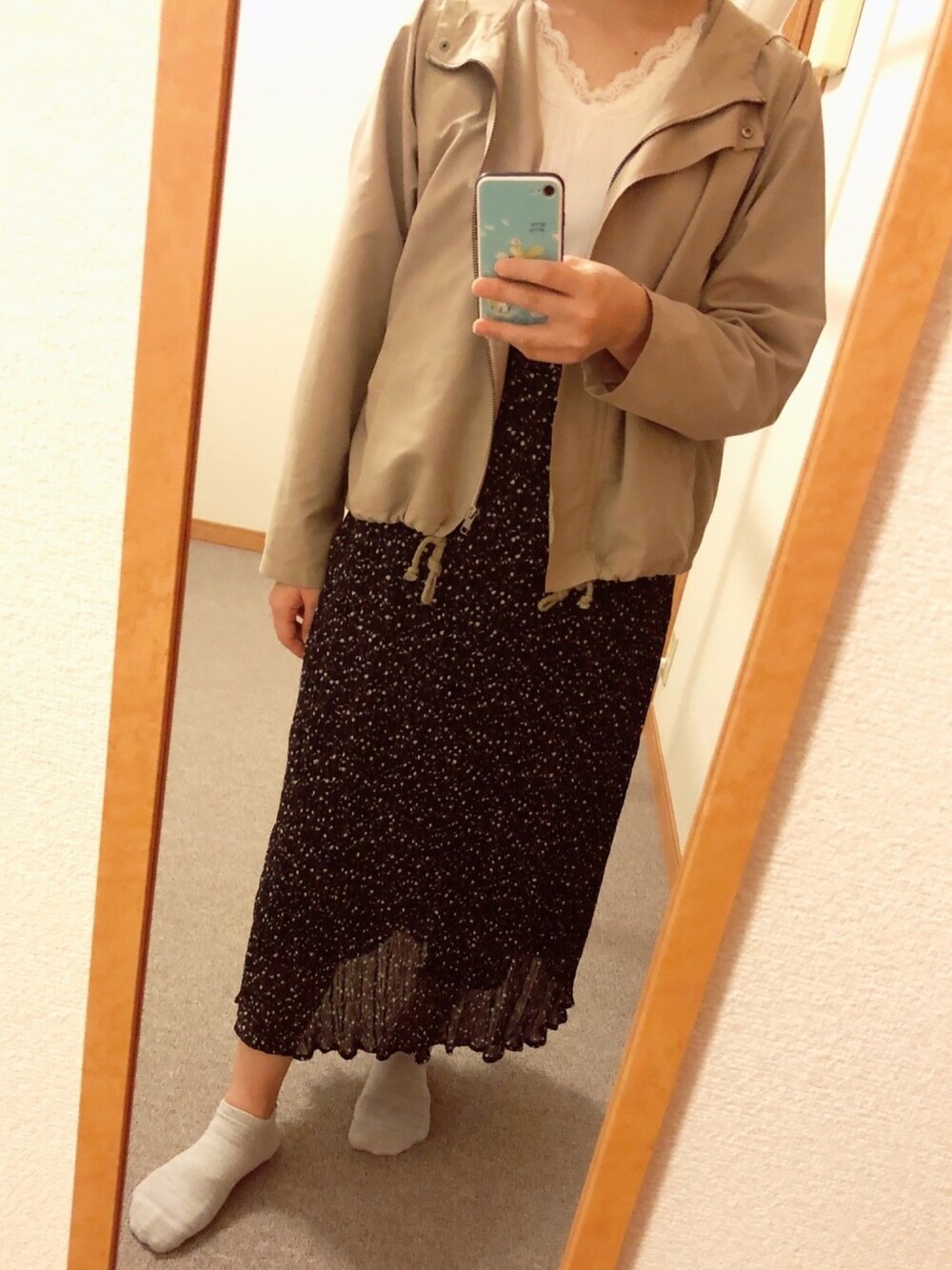 今日の通勤コーデ スカートはよく見るとチューリップ柄🌷