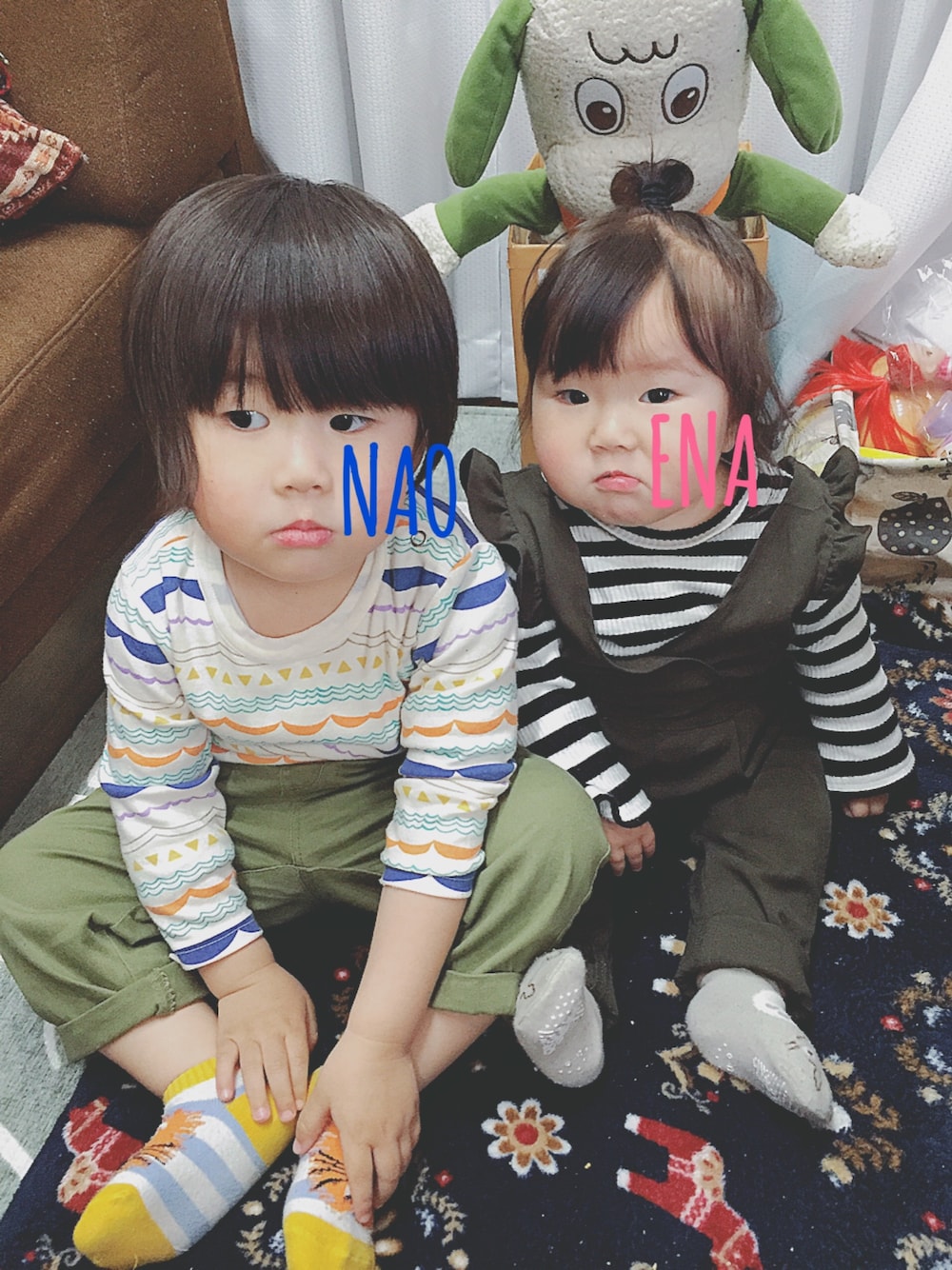 兄妹コーデ✨ 妹ちゃんのサロペット、西松屋で一目惚れしたのはいいけど…80サイズでウエストぴったりなのに股下が長くて4回くらいまくって履いてる😂