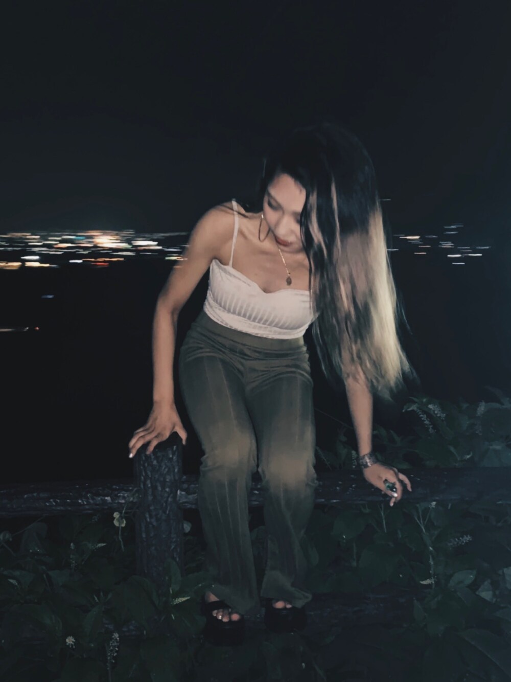 夜景が綺麗な背景をバックに🌃💫 カーキのフレアパンツもってない色味でかわいかったからゲット❤︎