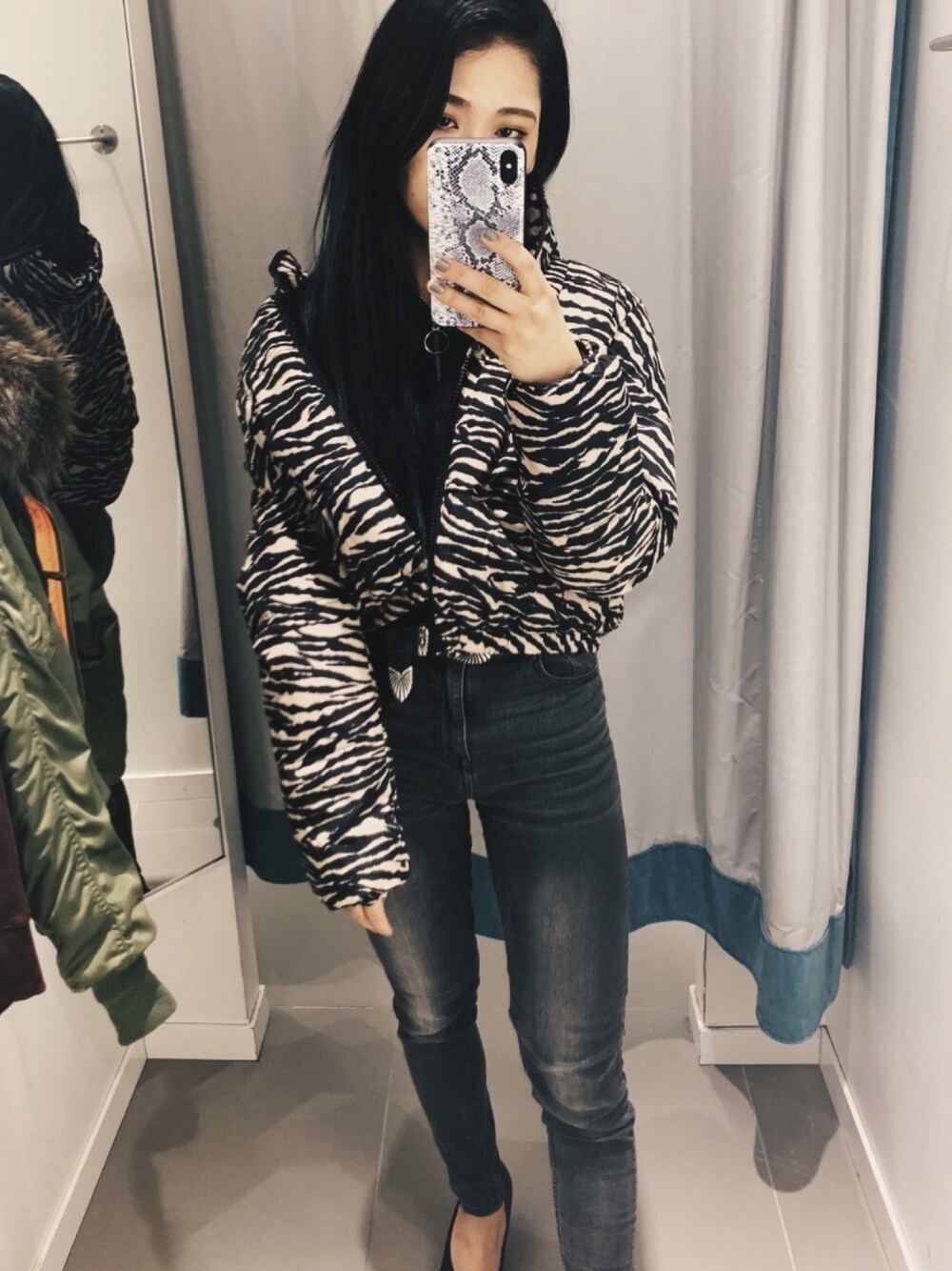 ゼブラ柄のダウンかわいい🦓 ケータイカバーがパイソンだからアニマルすぎ🥵ショート丈で足長効果抜群!🔥