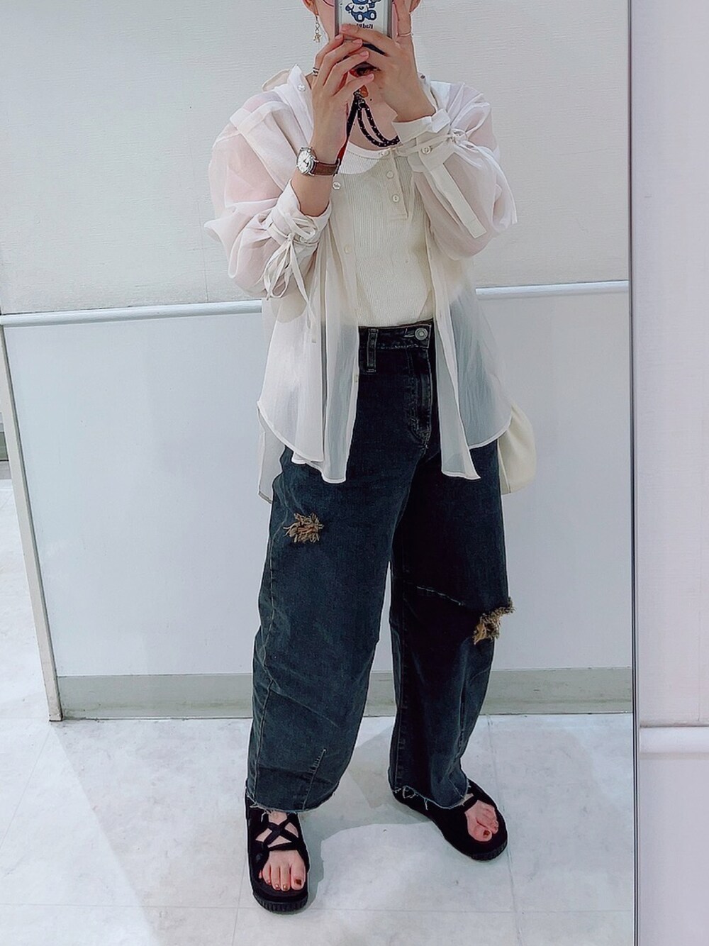 freaks store×somethingのデニムはマジでどのシーズンも可愛いがすぎます。タックワイドデニム実はもう一本持ってはいるのですが、今回のシーズンのこのダメージ加工や裾のフリンジがあるのをみて可愛すぎてもう一本買ってしまいました🤦🏼♀️古着ぽさもあるこの可愛いデニム、もっと可愛く育てたい…。