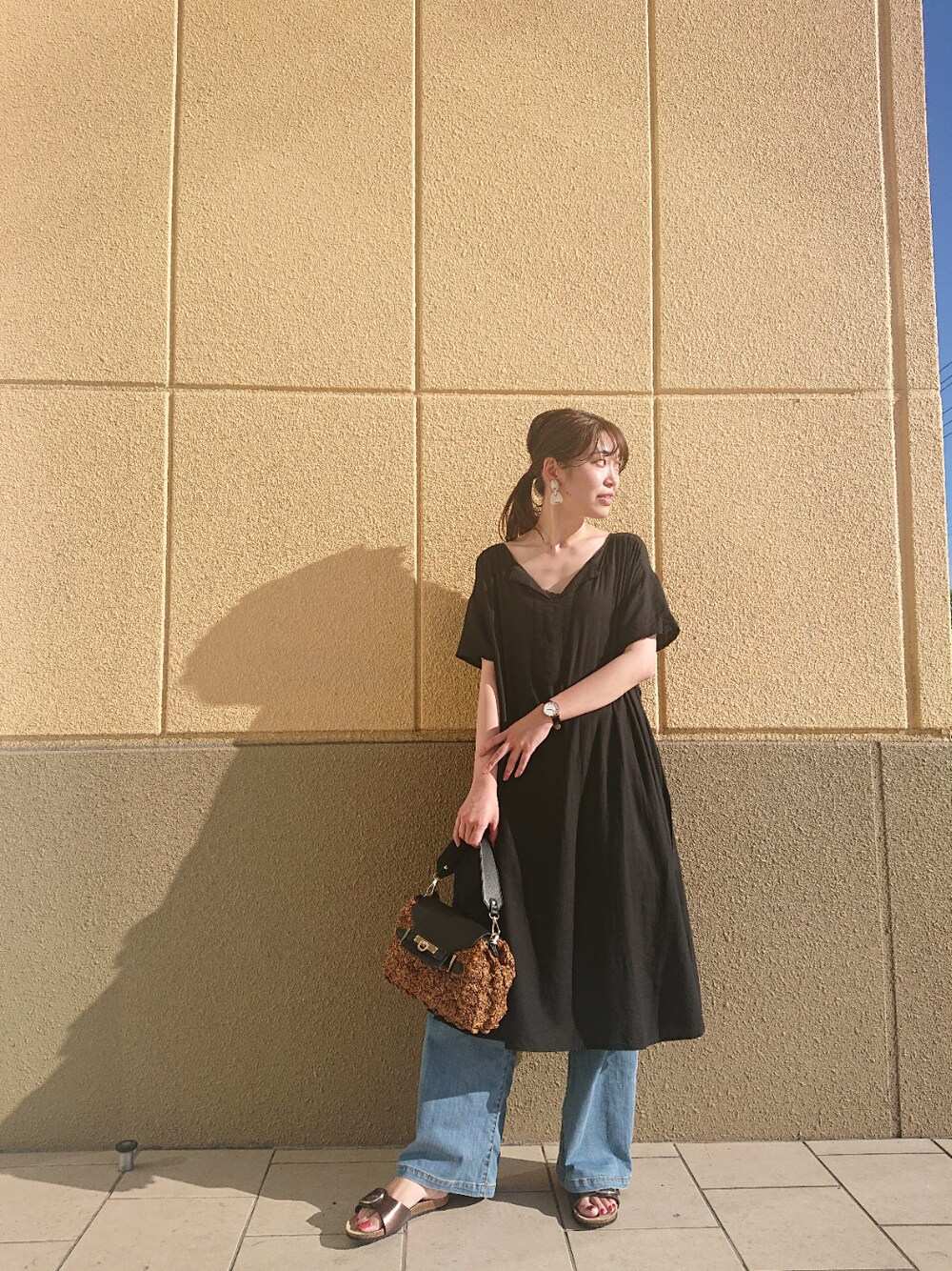 お気に入りのレーヨンリネンワンピ🖤 ワイドデニム合わせが気分です👖
