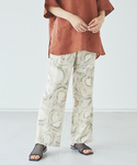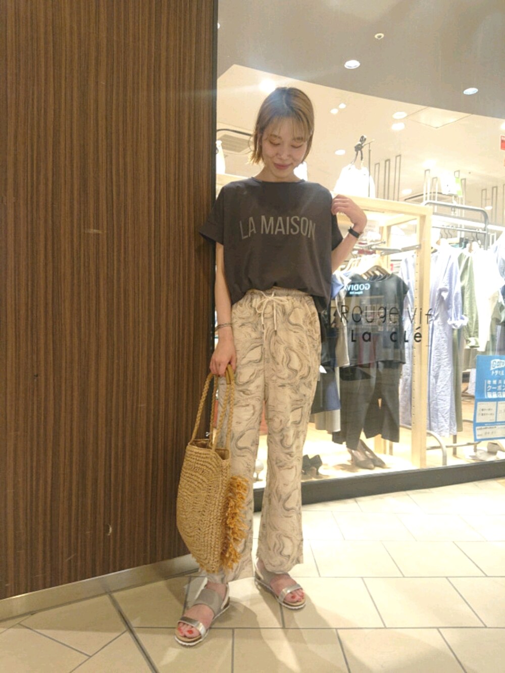 夏のロゴTコーデ👒柄のパンツでリラックスムード👡Tシャツのカラーをホワイトではなく、あえてチャコールグレーにすることで大人カジュアルに😌🖤