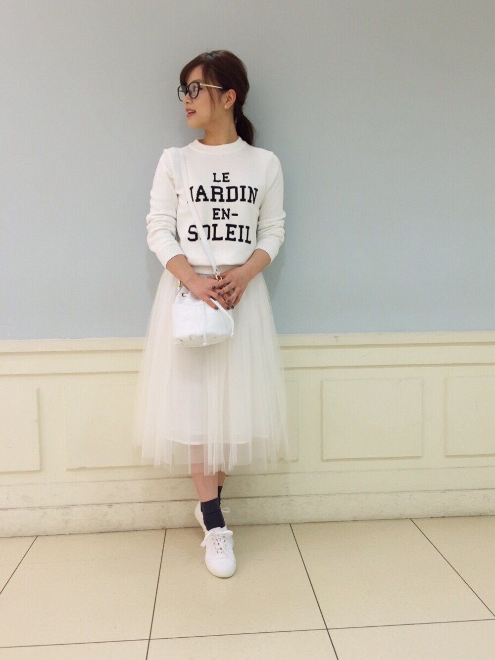 オールホワイトのコーディネートです。 カジュアルな白スニーカーを合わせれば、気軽にトレンドコーディネートができます。