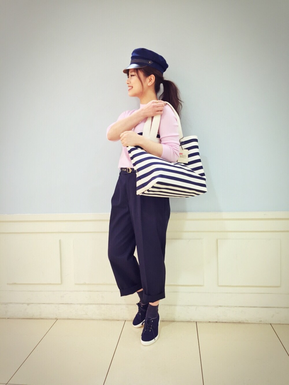 カトルナフのシンプルなニットは着心地抜群でオススメです。 帽子でランディらしいコーディネートです。