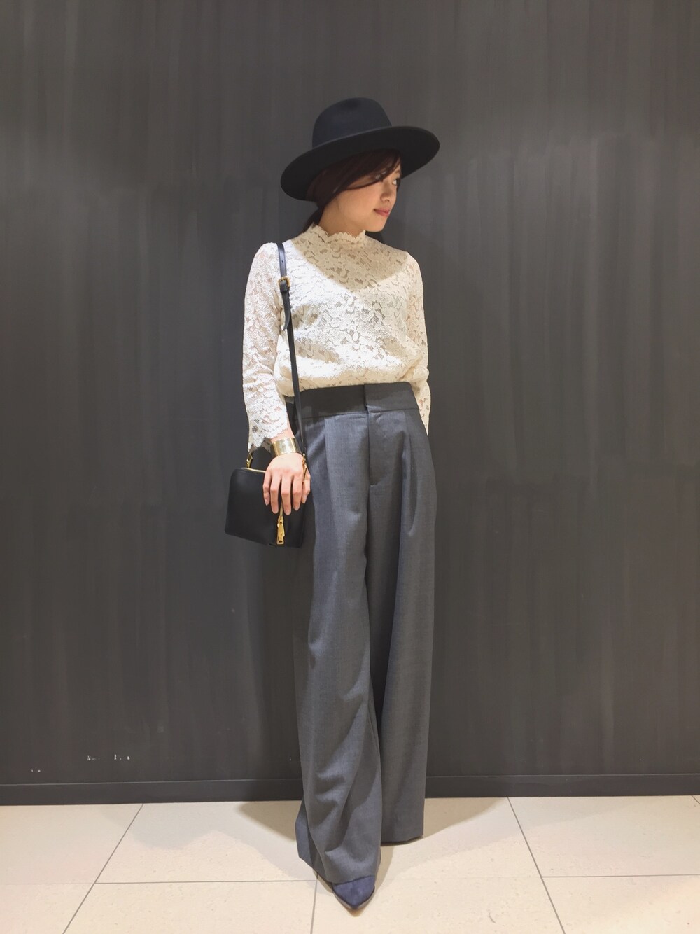 名古屋タカシマヤ限定のレースブラウスのコーディネート 全国展開のノースリーブレースブラウスの袖ありタイプ。1枚でも気軽に着られます♫ レースブラウスにはワイドパンツで甘すぎずにスタイリング!大人の方もレースアイテムが取り入れやすいコーディネートです♫