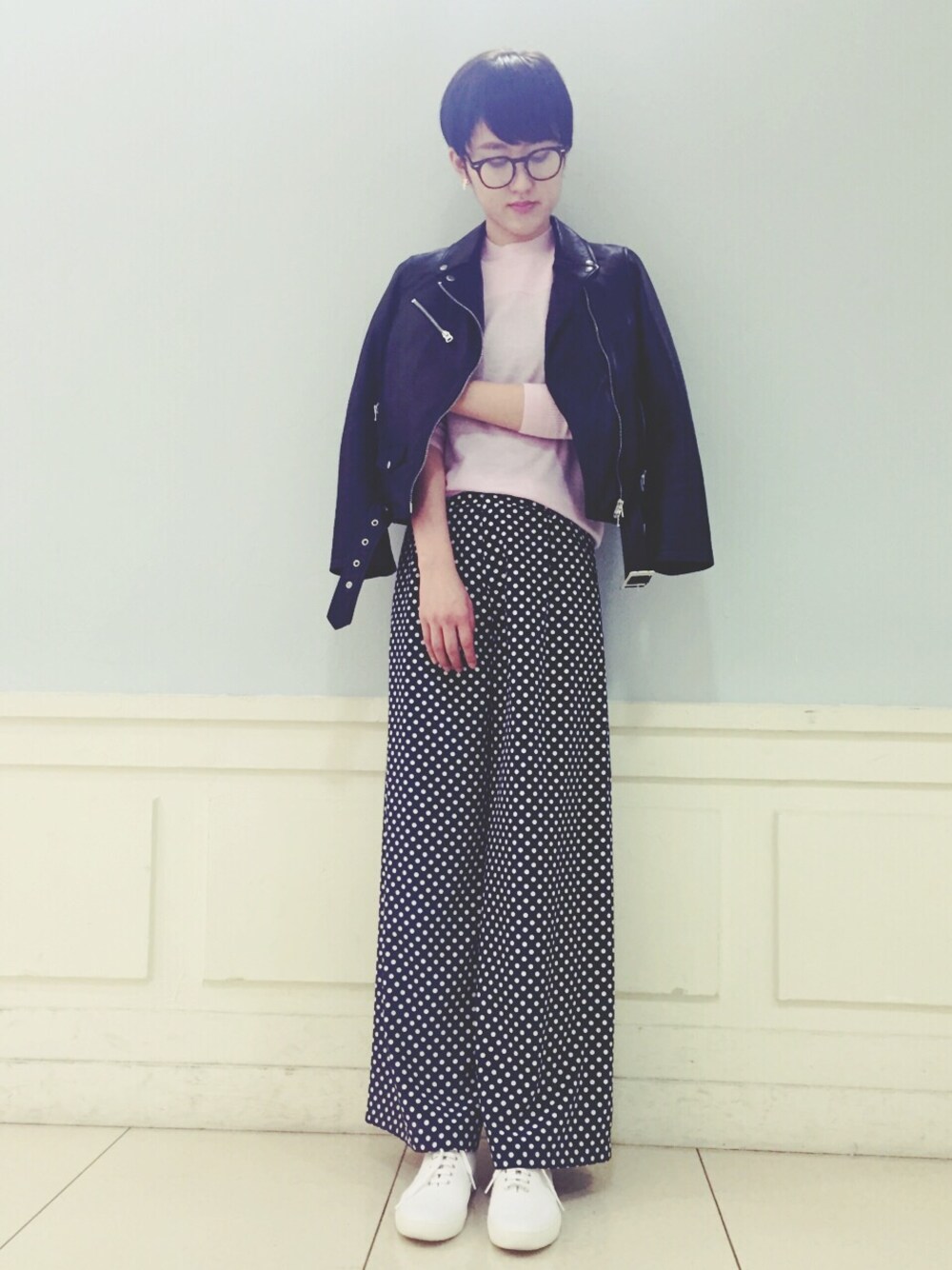 ピンクのニットは普段あまり着ないのですが… ライダースなどエッジィなアイテムと組み合わせると可愛いと思います(^∇^) 甘めなコーデが苦手な方は是非挑戦してみてください♪ カトルナフのドットのワイドパンツすごく可愛いです♡