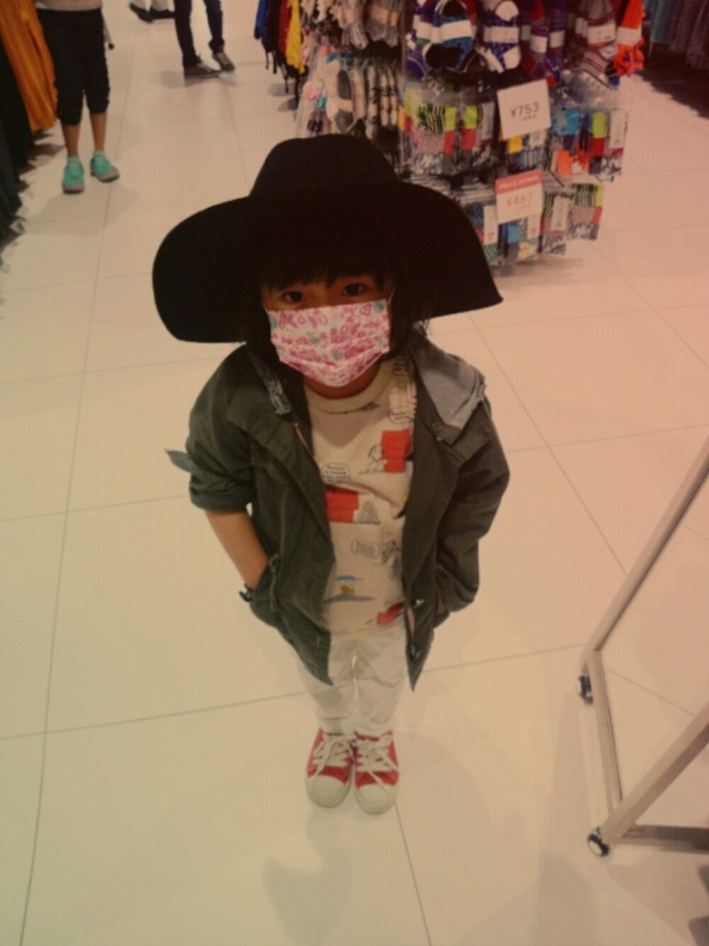 GUのお店で女優帽をかぶってみました☆ アウター→不明 Tシャツ→UNIQLO パンツ→西松屋
