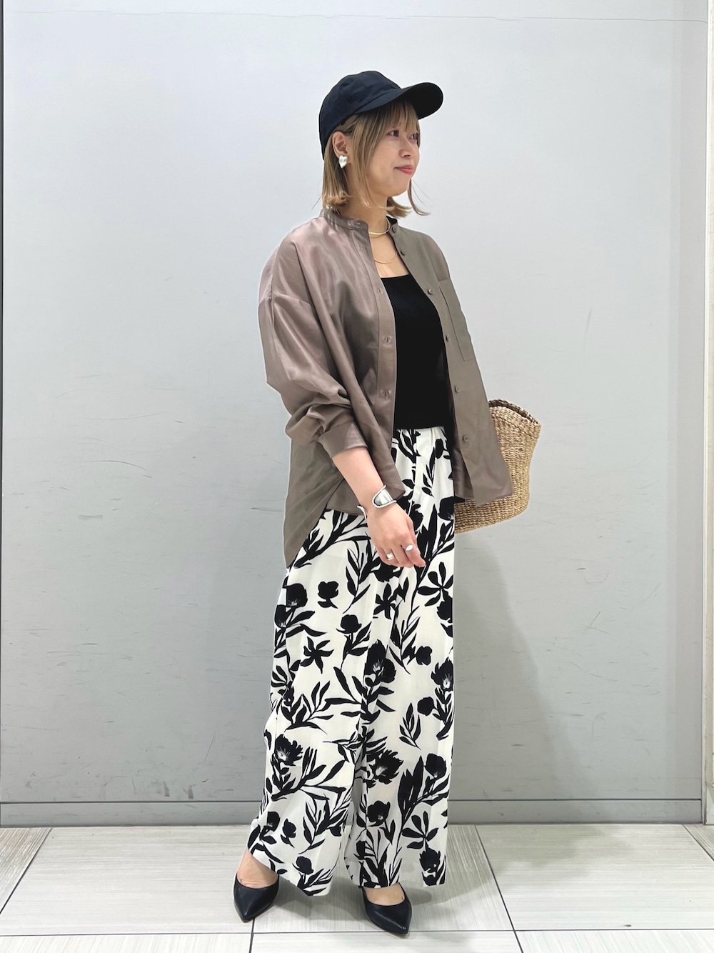 店 【基本プロフィール】 身長:160cm 骨格タイプ:上ストレート 下ウェーブ 普段着用サイズ:トップス 36or38/ボトム 38/シューズ 38 【シャツ】 着用サイズ:フリー ▼サイズ感 オーバー過ぎないサイズ感なので小柄な方からも人気です ▼着心地•生地感 さらりとしたシアー素材なので夏も日除けで着やすいです。 あまり透け感もなくお仕事用でも着やすいと言っていただけます。 ▼コメント 全国的に人気で、4色どのカラーも可愛いです! 【ボトム】 ▼サイズ感 38 ▼着心地•生地感 裏地もついており白でも透けないです! ウエストもぐるりゴムなので履き心地抜群! ▼コメント 今まであまりなかったこちらの柄は新鮮で早くも店頭で大人気! グレーもお洒落なのでぜひ見にいらしてください🎶