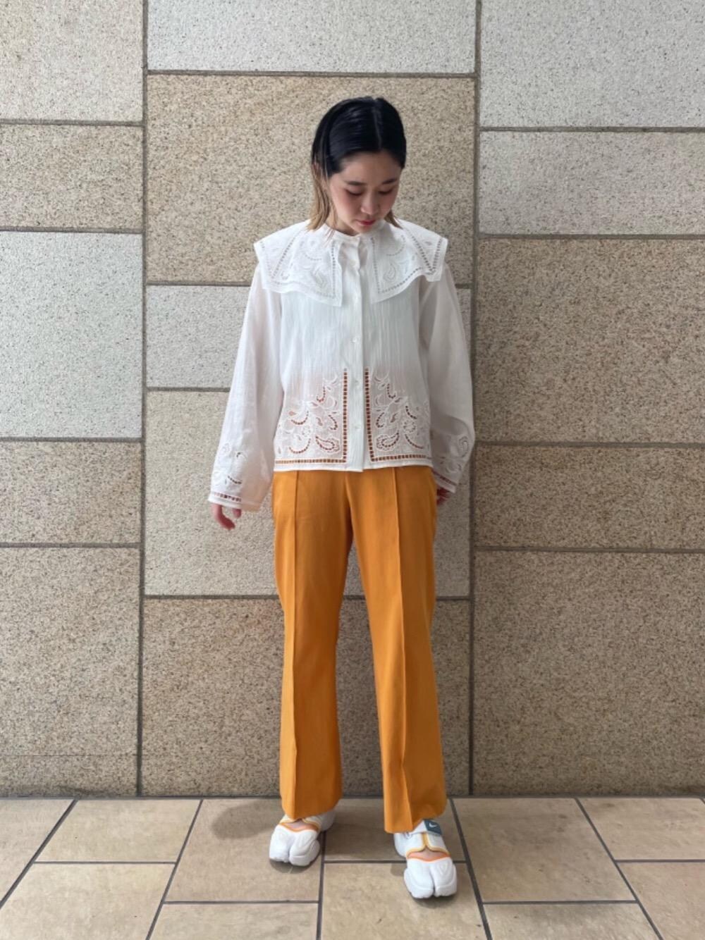 身長:160㎝ 普段着用サイズ:トップスS/パンツS/シューズ23.5㎝ パンツは丈感を少し長めに履きたかった為Mサイズを着用しております。少し大きめに着用してもセンタープレスがあるため綺麗なラインでお召しいただけます! トップもサイズかん少しゆったりめなのでピタッと感なく着やすいです。デザインも凄く可愛いので今時期にとてもオススメなアイテムです! ブラウスのデザインがとても可愛いのであえてシューズらアクアリフトにする事でカジュアルダウンさせました。