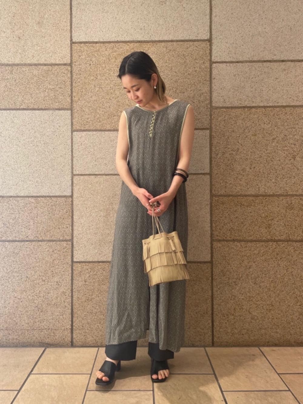 身長:160㎝ 普段着用サイズ:ワンピースS/パンツS/シューズ23.5㎝ ワンピースはサラッとした素材感でとてもリラックスしてお召し頂けます。2WAYなので前後逆で着ていただくことが出来るのでイメージを変えても着用できコーディネートも楽しんで頂けます! パンツは丈感を長めに履きたかったのでMサイズにしました。パンツの素材感もサラッとしていてサイズもゆったりなので着心地抜群です! 夏のリラックススタイルにオススメです!