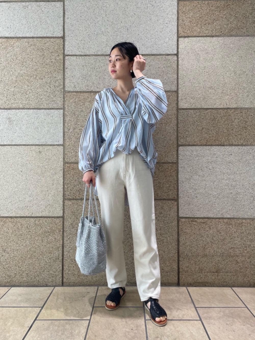 ・身長 160㎝ ・普段のサイズ トップスS パンツS サンダル36h 【サイズ感】 トップス:ゆったり パンツ :細すぎず少しゆとり有り サンダル:素材感柔らかく履きやすい トップスはシアーな質感と淡いカラーが涼し気な印象なので一気に夏らしくお召し頂けます。 パンツもホワイトで爽やかなコーディネートにしてみました!