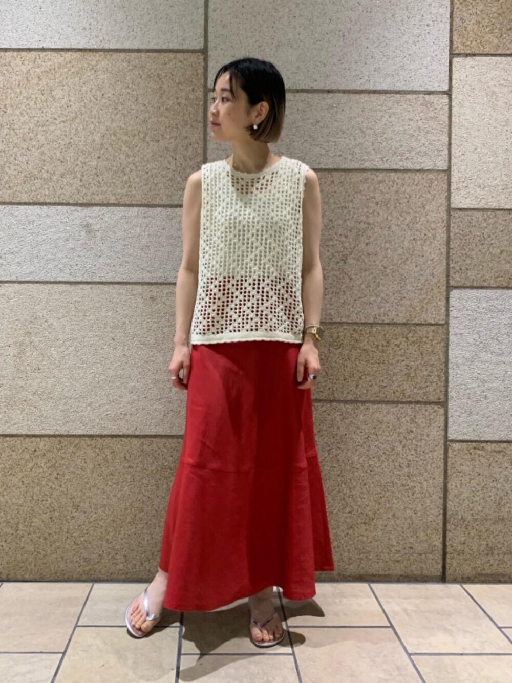 身長 160㎝ トップスS スカートS サンダル23cm 【サイズ感】 トップス:コンパクト 着丈短め スカート:ウエストすっきり 着丈長め サンダル :適度なゆとり 赤のスカートが映えるコーディネートです! 麻素材で夏も涼しくお召し頂けます。 トップスは今年トレンドのクロシェ編みが可愛くお洒落に来て頂ける今年オススメなコーディネートです。