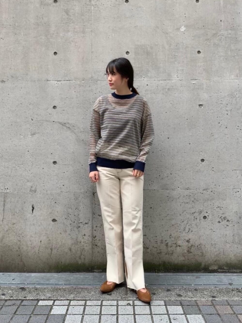 カジュアルなボーダーも透け感で女性らしい印象に着られます。ホワイトデニムとポインテッドトゥの合わせできれいめカジュアルにまとめました。