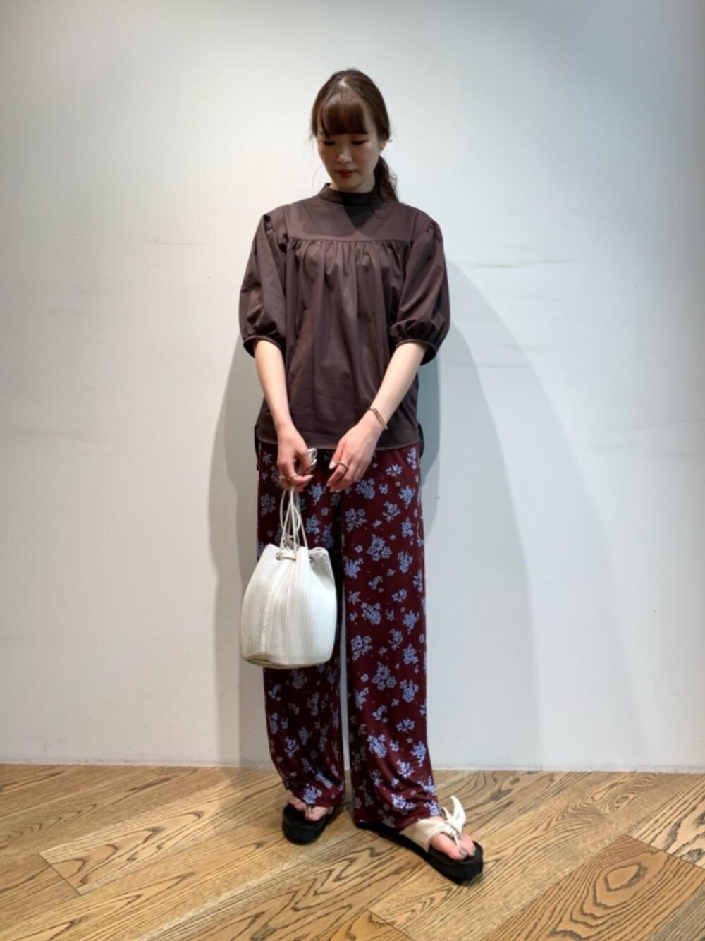 今すぐ着たいフラワー柄のイージーパンツが入荷致しました。ボリュームスリーブのトップスとの合わせが今季らしい印象になります。ブラウンとワインカラーで大人な晩夏スタイルにしました。